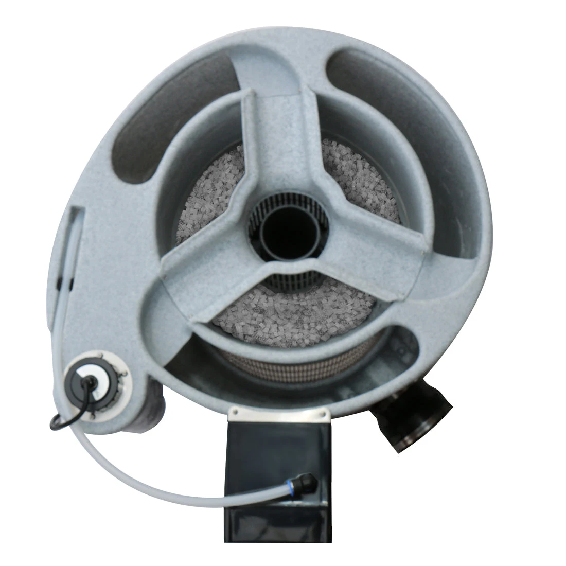 The size of the perforations will not allow large mechanical waste to enter the inner chamber, thus acting as a first stage mechanical filter. The inner chamber holds 18 litres of static K1 Micro media. As the water enters the inner chamber, the fine smaller solids become entrapped in the K1 Micro. After passing through the K1 Micro, the clean water then rises and overflows into the inner return pipe. From here it returns to the pond via the return outlet.