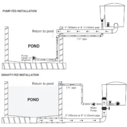 By this we mean that if your pump is going to be used to supply the water to the filter, and the filtered water then returns back into your pond via gravity, i.e. down a waterfall, or through a large diameter pipe, this is referred to as PUMP FED (i.e. the water is fed to the filter using a pump).