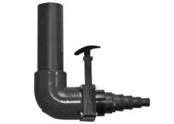 Water from the pond enters the nexus via the inlet into the inner chamber which works as a vortex allowing larger solids to settle out.