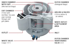 The outer chamber is where the final stage of biological treatment occurs. Biological breakdown occurs through different strains of bacteria living on the protected surface area on each piece of the K1 Media. These bacteria convert Ammonia and Nitrite into harmless Nitrate. The amount of Ammonia and Nitrite produced in the pond is dependent on feed rates and the type of food used. For higher feed rates additional K1 Media should be added into the outer chamber.