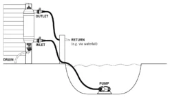 Water is pumped up through the Evolution Aqua Surge Filter with 18 watt UV. The K+Media moves to the top of the filter, becoming a mechanical barrier that traps debris as it flows through the system. Waste is trapped in the K+Media until the cleaning cycle dislodges it and it gets flushed away.
