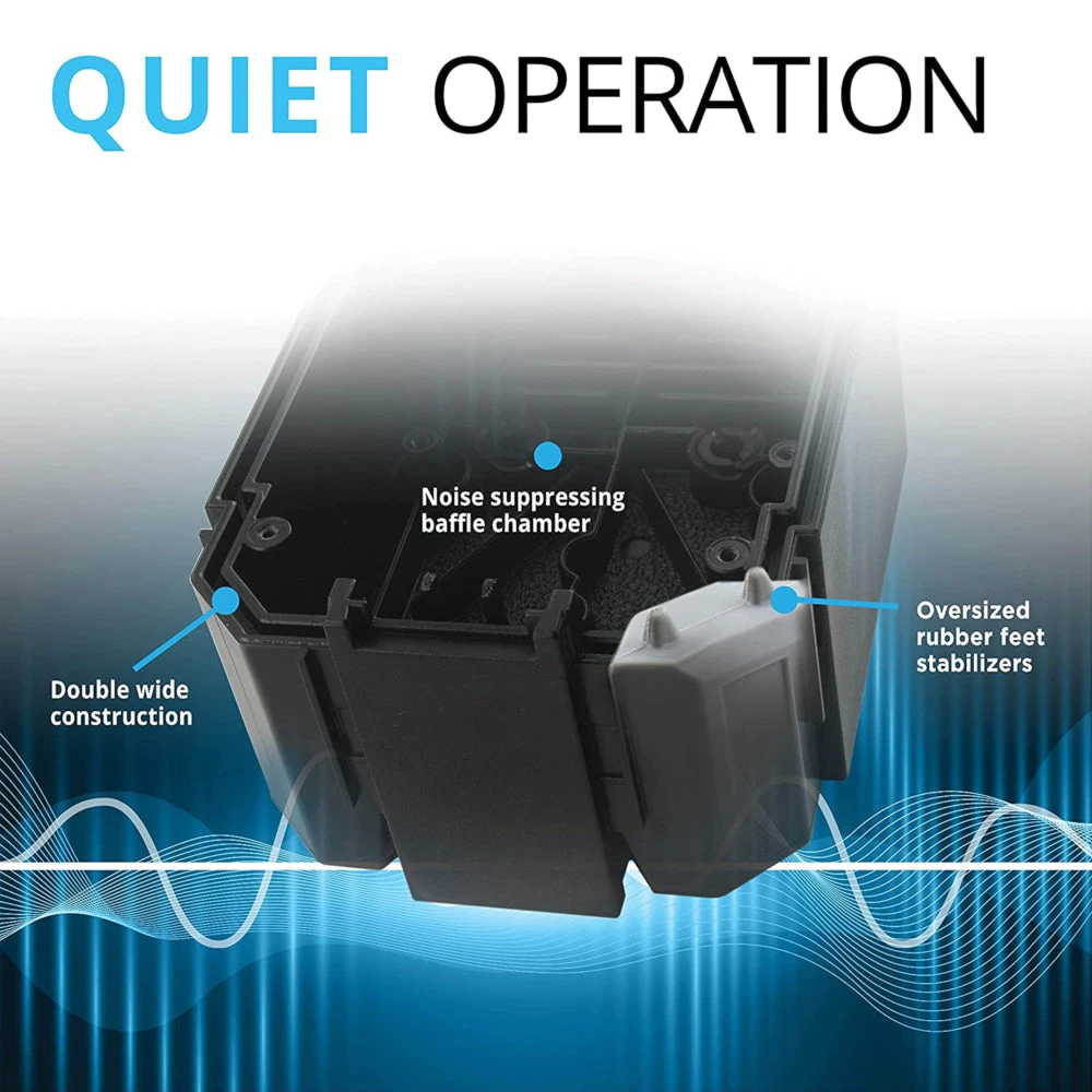 The A Series Air Pumps have also been designed to be ultra-quiet. Each model hosts and engineered noise dampening baffle chamber and oversized rubber feet to ensure both stability and maximum noise prevention.