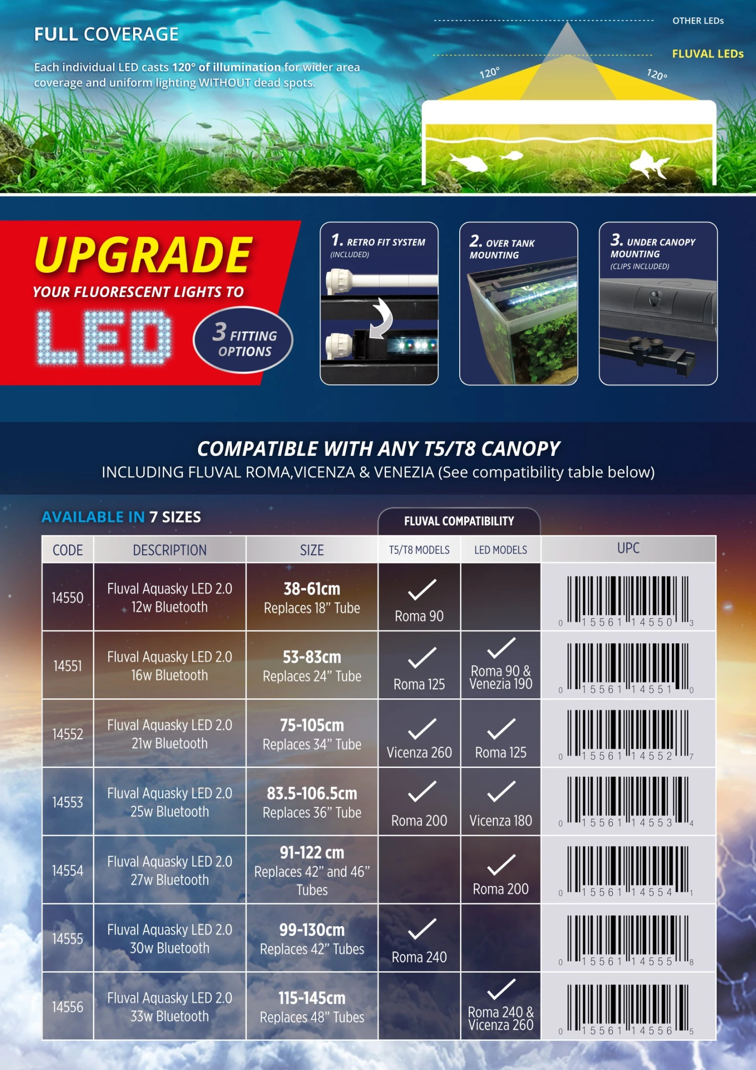 The Fluval Aquasky series feature 3 fitting options including a retro fit system for aquariums already equipped with T5/T8 lighting, over tank mounting brackets and under canopy mounting making upgrading your aquarium lighting to LED easier than ever.