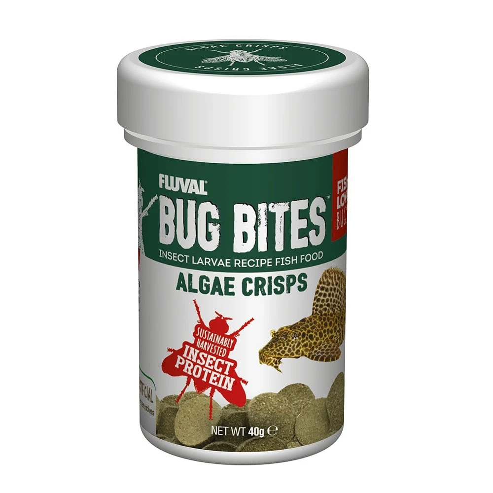 Fluval Bug Bites Algae Crisps are specifically formulated to address the natural, insect-based feeding habits of fish, with added vitamins, minerals and other trace nutrients important to their health and vitality. Ideal for all bottom feeders (plecos, ancistrus, loaches, corydoras cats, etc.), this formula includes nutrient-rich spirulina and kelp, in addition to quality insect protein for increased digestibility and optimal fish condition, growth and coloration. The durable food format provides your bottom dwellers the time they need to leisurely grind away at their food.