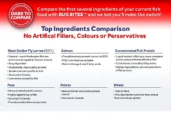 Bug Bites™ are more than just insects. We’ve included other excellent protein sources like whole salmon, which is rich in Omega 3 and 6 for healthy skin, scales, fins and colours. We’ve also added essential vitamins, minerals, amino acids and other trace nutrients that are vital to the health of your fish, while avoiding artificial colours and preservatives to make Bug Bites™ a completely nutritious and balanced food.