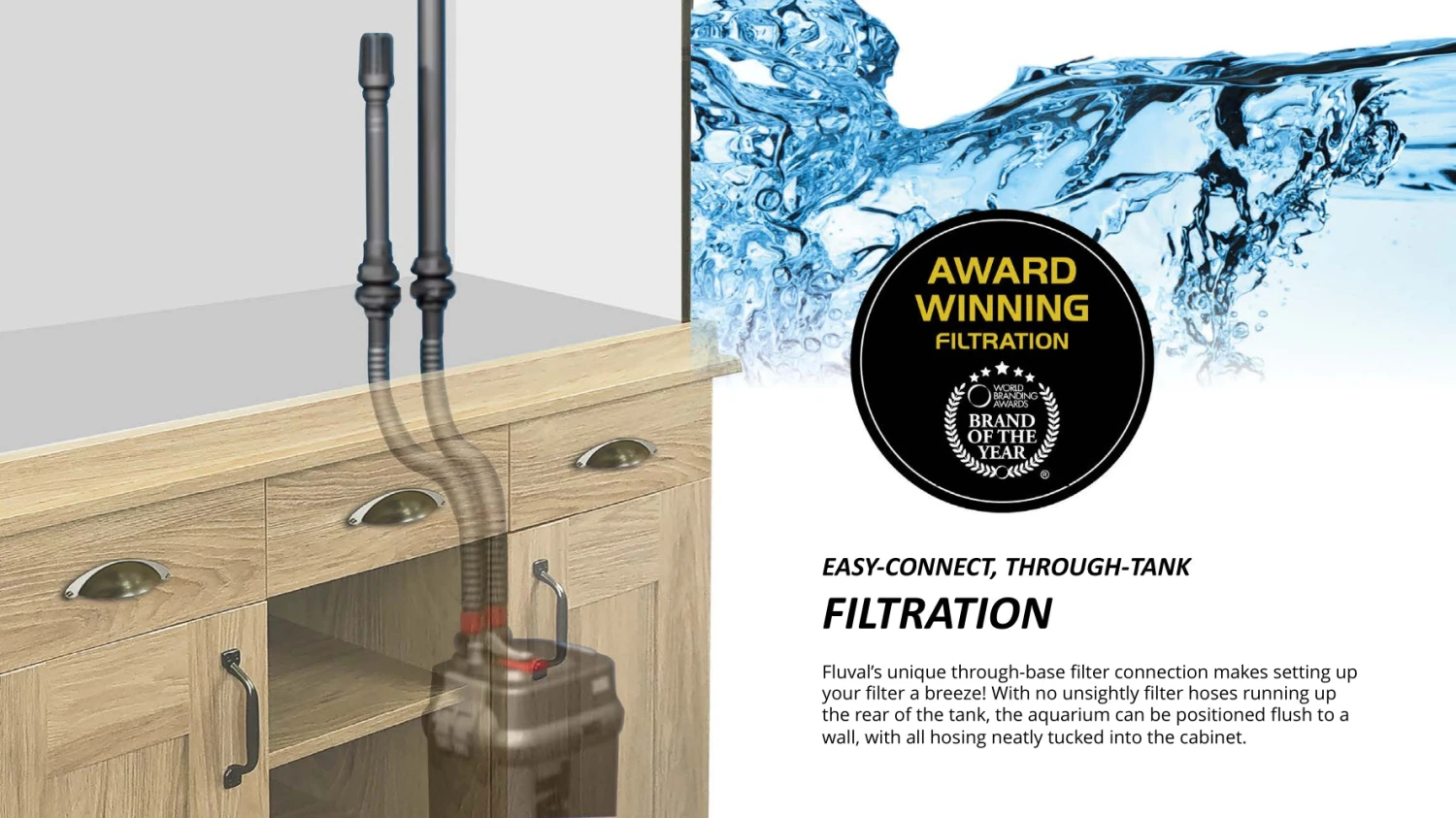 Fluval’s unique through-base filter connection makes setting up your filter a breeze! With no unsightly filter hoses running up the rear of the tank, the aquarium can be positioned flush to a wall, with all hosing neatly tucked inside the cabinet.