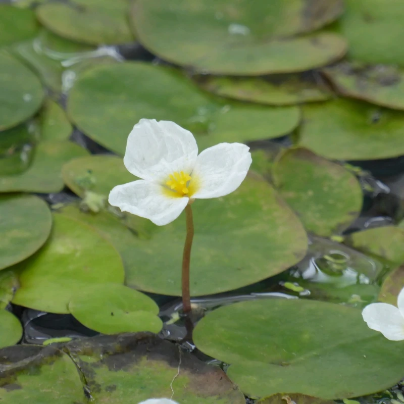 Hydrocharis Morsus Ranae, commonly known as Frogbit, is a pretty little native plant with small kidney-shaped, bright green leaves and very small white flowers. Frogbit is a summer plant that can tolerate dense shade, allow frogbit to die back naturally in the autumn, as small buds are formed which fall off and sink to the bottom while the old plant rots away. These winter buds remain on the bottom to rise again in the spring to form new plants.
