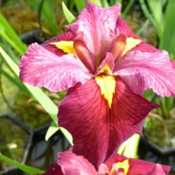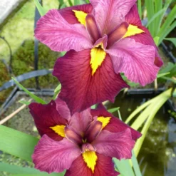 Iris Louisiana Ann Chowning has velvety dark cherry red flowers with a yellow centre, it received the Mary Swords Debaillon Award, the highest given to a Louisiana iris. As with all iris the tubers are harmful if eaten. After foliage has died back in Autumn cut back to just above the water surface. If trimming left until spring take care not to damage emerging shoots.