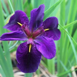 Iris Louisiana Black Gamecock, produces stunning, giant, deep purple, near-black blooms. As with all Louisiana iris it is ideal for the pond as it loves plenty of moisture. As with all iris the tubers are harmful if eaten. After foliage has died back in Autumn cut back to just above the water surface. If trimming left until spring take care not to damage emerging shoots.