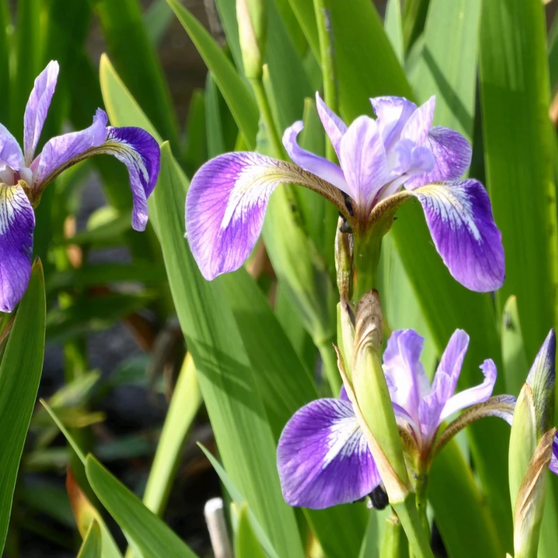 Iris Versicolor Blue Flag has narrow, erect foliage and branched stems bearing several bluish-purple flower with spotted yellow throat. As with all iris the tubers are harmful if eaten. After foliage has died back in Autumn cut back to just above the water surface. If trimming left until spring take care not to damage emerging shoots.