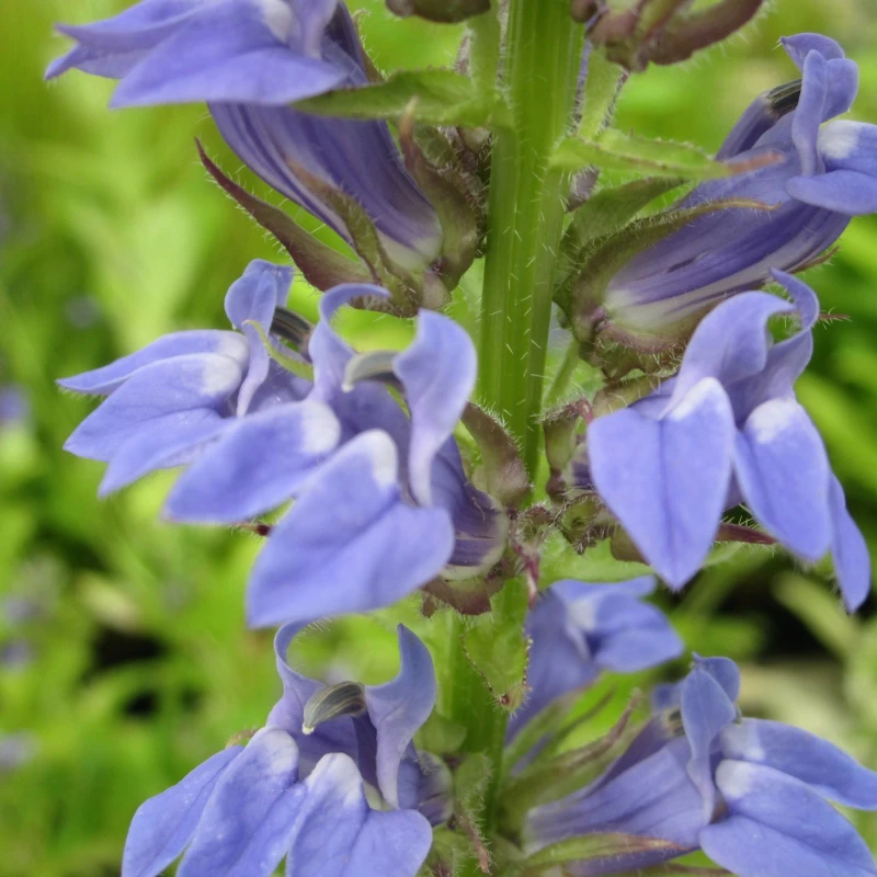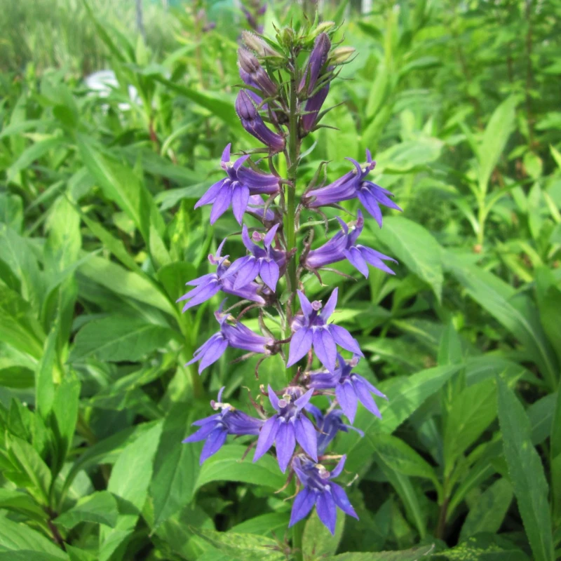 Lobelia Siphilitica, or the Great Blue Lobelia, is a showy perennial with lanceolate, light green leaves. The erect stems produce lavender-blue, tubular flowers crowded together on the upper part. The species name is based on the fact that it was a supposed cure for syphilis. Little maintenance is required. Trim to tidy but leave foliage to die back naturally to encourage winter bud formation.