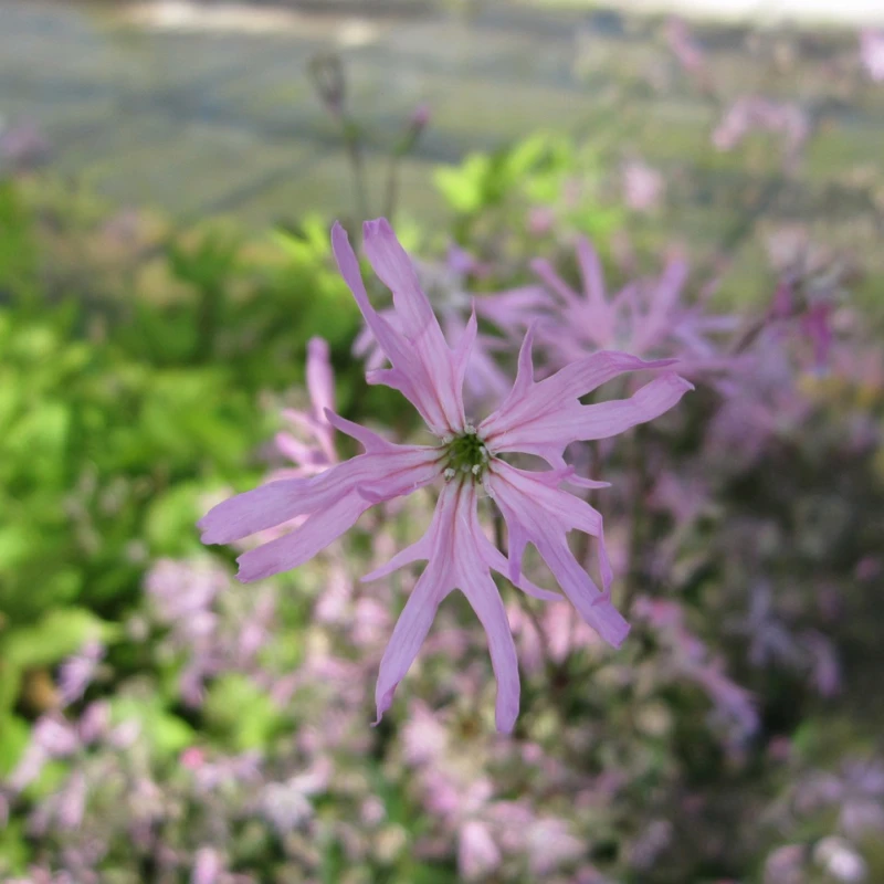 Lychnis Flos Cuculi, known as the Ragged Robin, has branched stems that bear opposite, lance-shaped leaves. Clusters of star-shaped deep rose-pink flowers, each petal deeply cut into 4 narrow segments, appear in late spring and early summer. It prefers to be in moist soil rather than in the water. Little maintenance is required. Trim just above the water surface after foliage has died back in Autumn to tidy.
