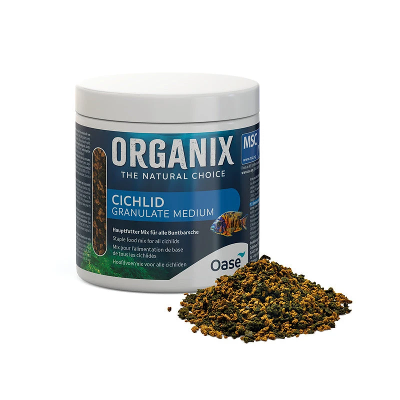 Organix Cichlid Granulate from Oase has been specially formulated for the species-rich fish family of cichlids. Oase Organix Cichlid Granulate Medium is a granule food designed to cater for medium to large cichlid species. Cichlid Granulate provides the optimal combination of proteins, fats, carbohydrates, vitamins and trace elements from sustainable seafood making it ideal for everyday feeding, to deliver all the important nutrition that cichlids require.