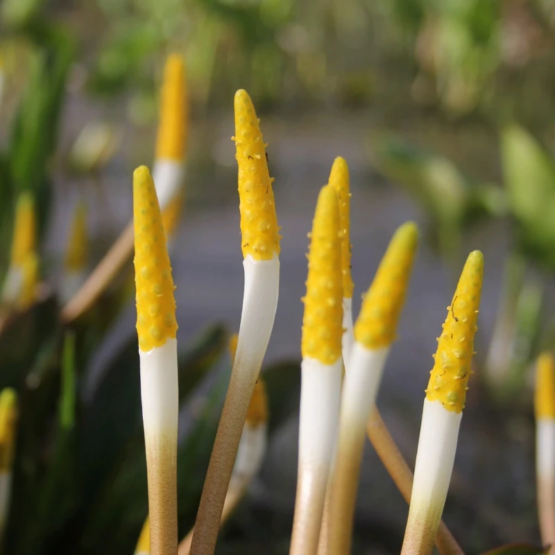 Orontium Aquaticum, or Golden Club, is an unusual plant with attractive yellow flower spikes on white stems. It has numerous flowers prior to the leaves growing large ensuring they stand out clearly. Do not remove the pot as damaging the roots will seriously impair the plant health. After foliage has died back in autumn remove dead leaves from the water.
