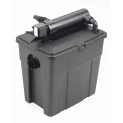 The filter has multiple chambers with four different filer media, and a UVC clarifier for eliminating suspended algae and turbidity.